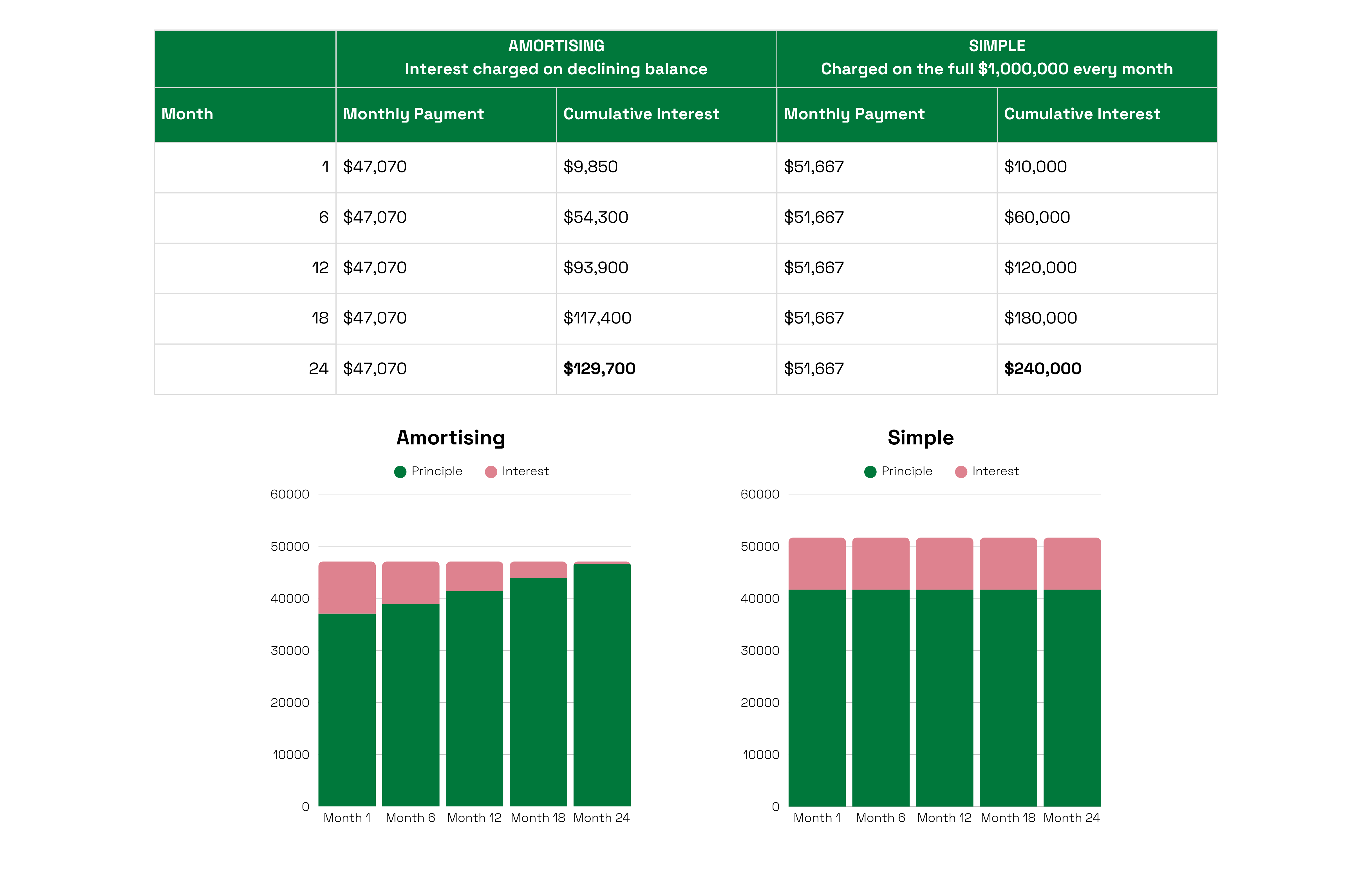 While monthly repayments may look similar at the start, the total interest paid over the loan term is materially lower when compared to a simple interest structure.
